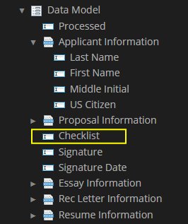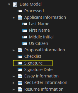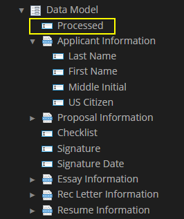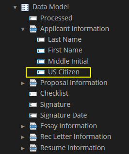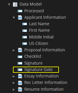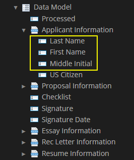 • Note: Data Fields in Data Sections will have their names appended to the Data Section's name. For example the "Proposal Title" Data Field in the "Proposal Information" Data Section's name translates to "Proposal_Information.Proposal_Title".