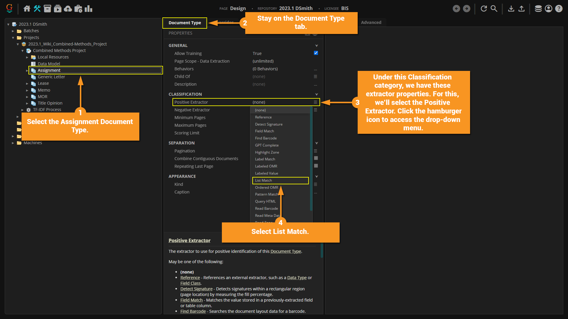 3. In addition to the Classification Method one can choose on the Content Model, the Document Type has its own Classification section. Here, one can configure both Positive and Negative Extractors. These Extractors work by either positively identifying data that you want to be extracted and thus used to classify a document as a particular Document Type, or to exclude text data from classification. Here, we'll be configuring the Positive Extractor. Select the hamburger icon at the far right of the property to expand the drop-down menu.