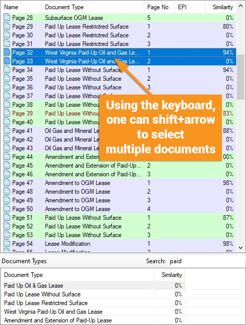 The keyboard should be the only control needed to work through Separation Review. When one or more pages are selected, start typing the name of the Document Type. This will filter the Candidates list view. Typing “paid” in this example, reduces the candidate list to five Document Types because their names have the word “paid” in them.