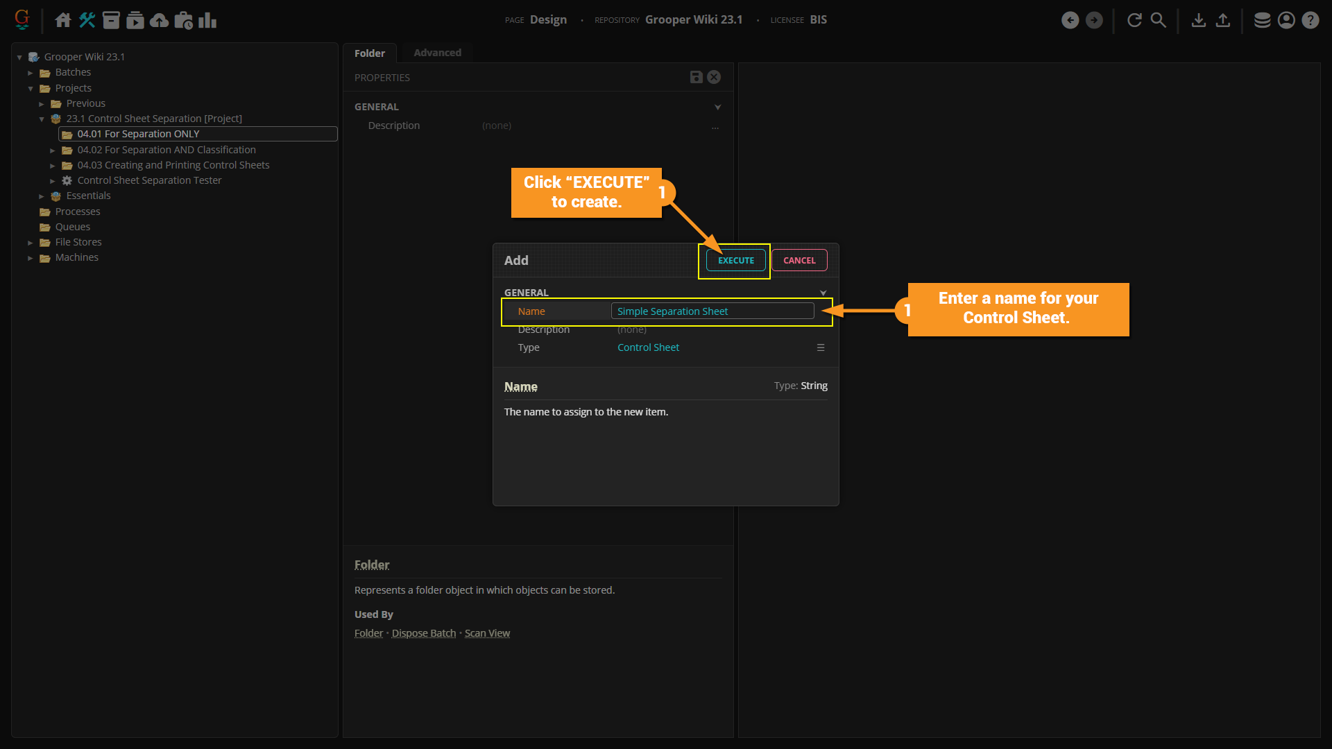 2. Click the "EXECUTE" button at the top of the "Add" window to create the Control Sheet.
