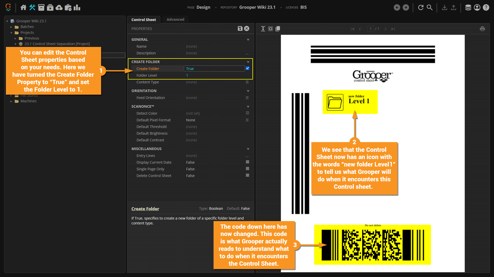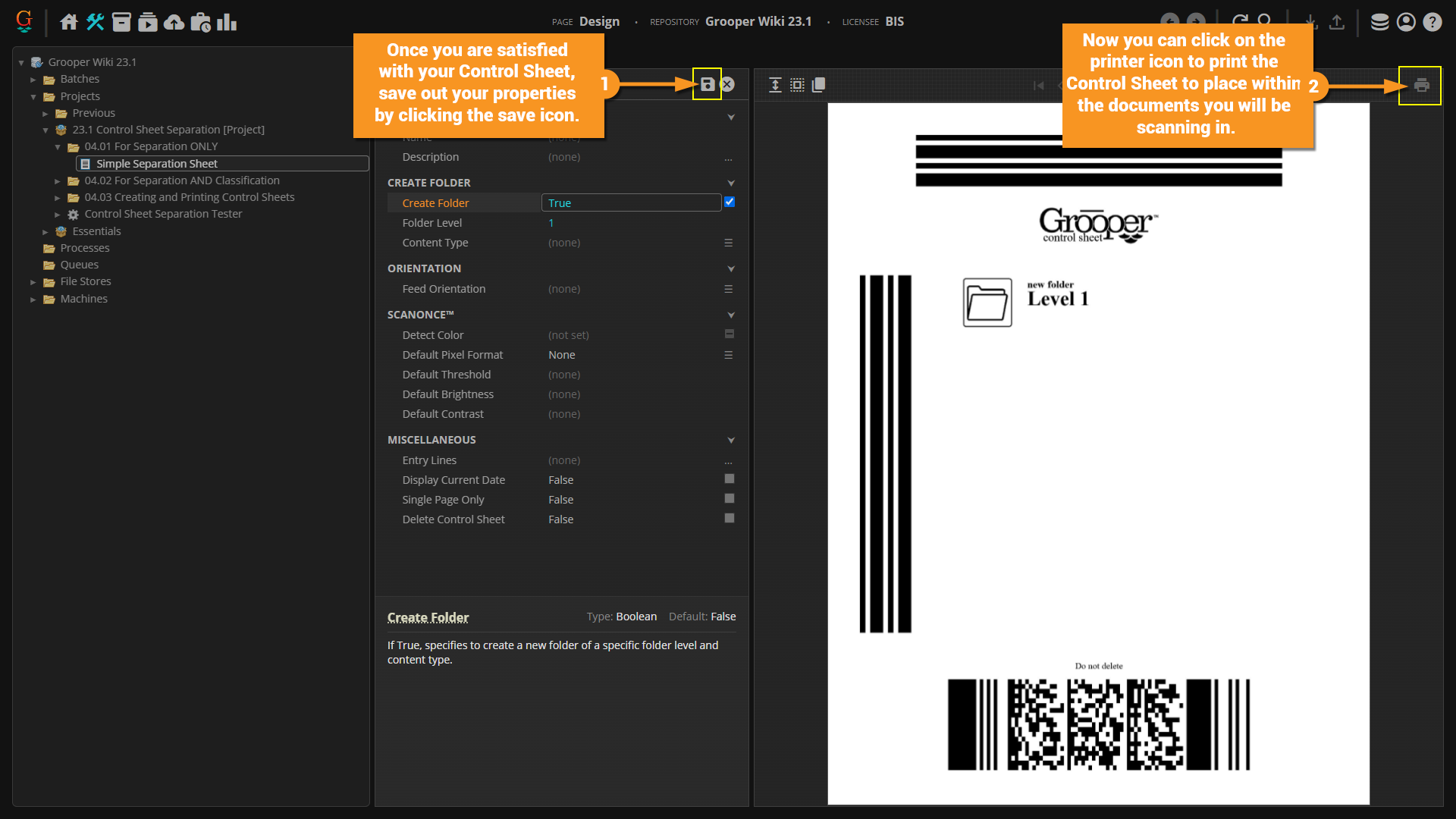2. On the Control Sheet preview, we can see there is now an icon with the words "new folder Level 1" to tell us (the human) what Grooper will do when it encounters this Control Sheet.