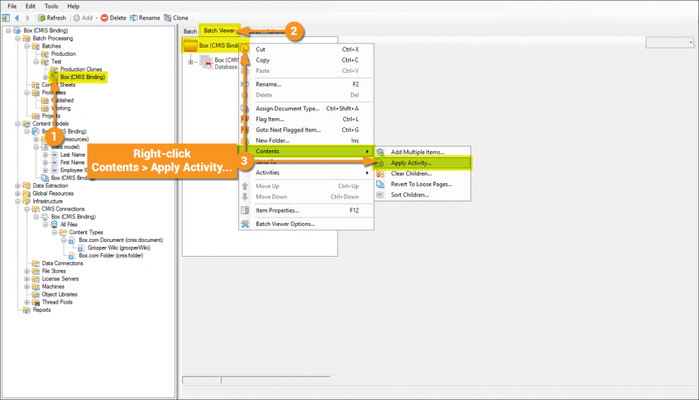 Right-click on the Batch Folder and use the Contents > Apply Activity... object command.