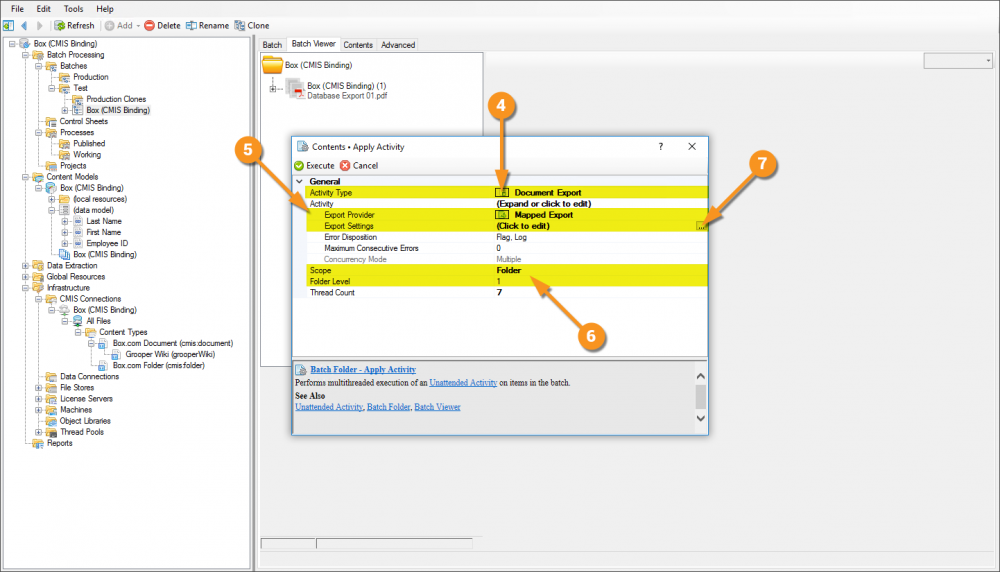 In the subsequent Contents • Apply Activity window, set the Activity Type to Document Export.
