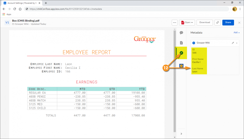 In your Box environment, you can now select your newly exported file and see it has metadata populated from the extraction performed in Grooper.