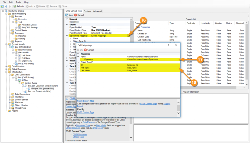 CMIS Content Type fields can be mapped to GrooperData Fields. However, Data Fields that exist within Data Sections with the Scope property set to MultiInstance cannot be mapped.
