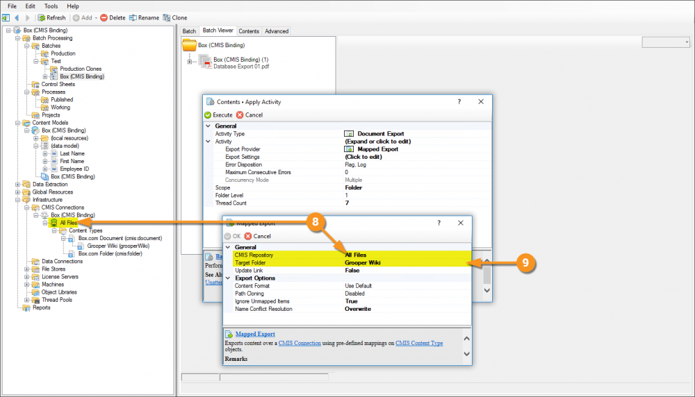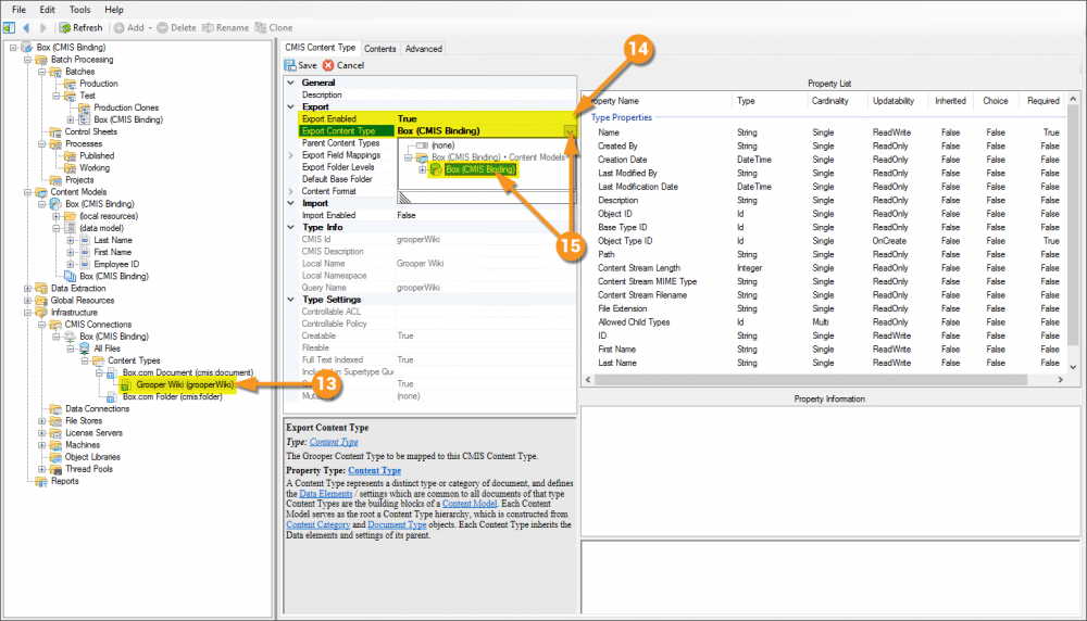 In Box files live in folders, and Metadata Templates are created and can be applied to any folder. In Grooper, the CMIS Content Type is configured for export against the appropriate Metadate Template, while export is executed against the actual Box folder.