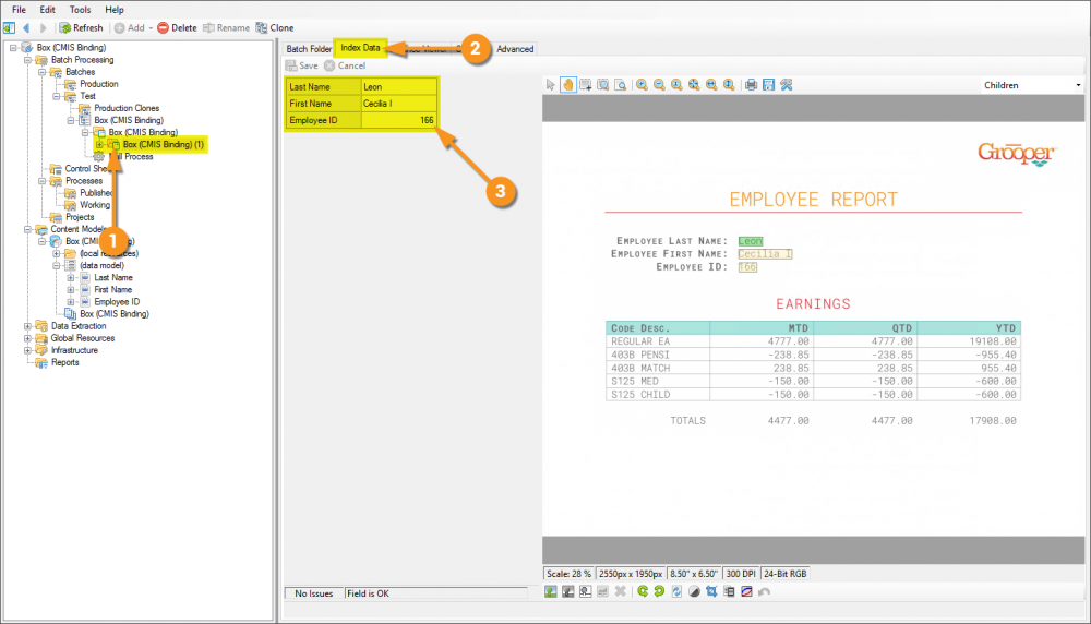 The purpose of this Content Model is to simply extract three fields of information from the document in its accompanying Batch.