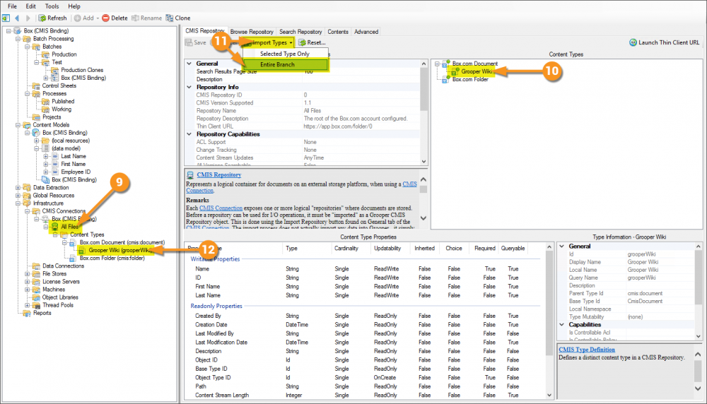 It will also create several objects in the Grooper node tree: CMIS Repository ojbect, Content Types folder object, and two CMIS Content Type objects - Document and Folder.