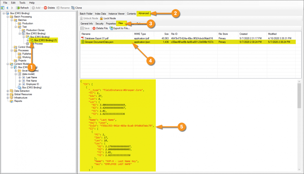 Before the Document Export activity can send data, it must have data. It's easy to get in the habit of testing extraction on a Data Field or a Data Model and feel good about the results, but it must be understood that the information displayed when doing so is in memory, or temporary. When the Extract activity is successfully run against a properly classified document (you can at the very least manually assign a Document Type) it creates Index Data and marries it to the document via a JSON file called Grooper.DocumentData.json. A couple of ways to verify its existence are as follows.