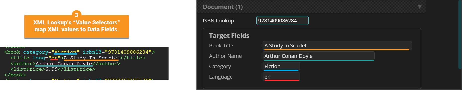 2. XML Lookup runs its "Record Selector" to locate one or more XML nodes. In this case the selector selects a <book> node whose isbn13 attribute matches the value Grooper extracted.