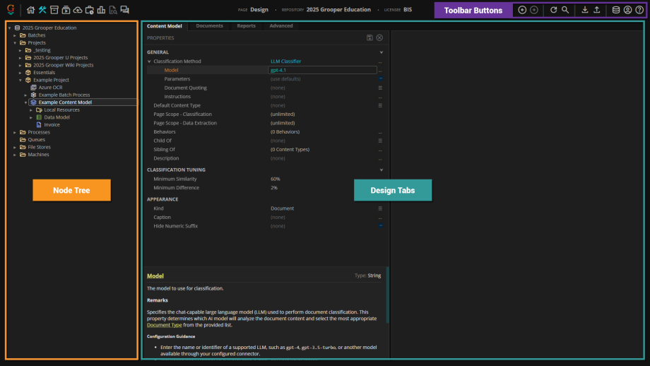 The Design page is the primary user interface for Grooper configuration. It is the central workplace for Grooper designers and administrators. From the Design page, users create, test and administer nodes in a Grooper Repository.