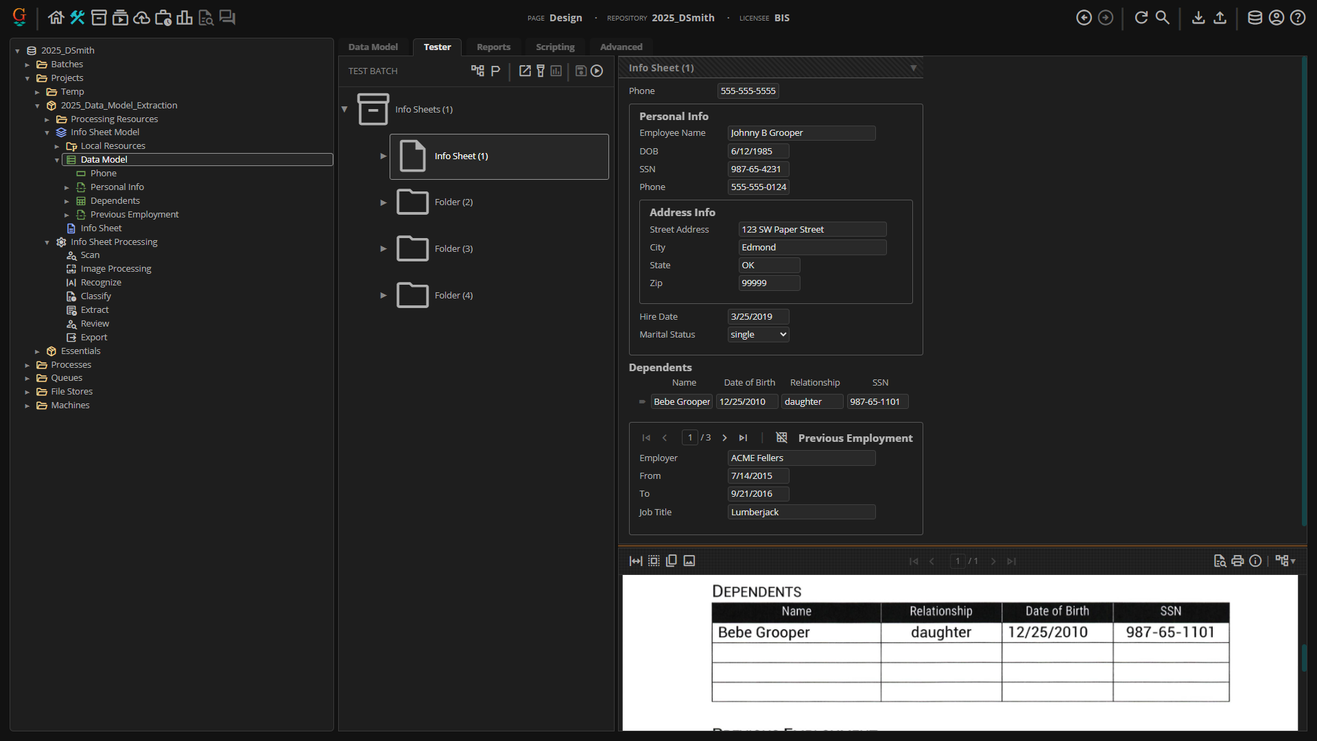 During extraction, Grooper uses the Data Model to guide the process. Each child element extracts its data from the document, and the results are fed up to the parent Data Model. The extraction process is typically performed by the "Extract" activity on a Batch Folder. For more information about the Extract Activity, click here.