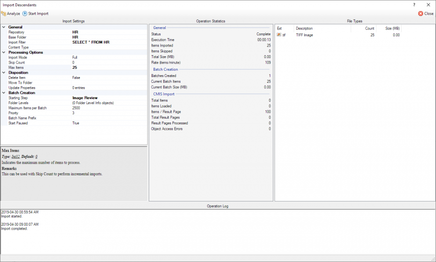 - Pressing "Import" will create a batch of documents that were imported using your configured settings.
