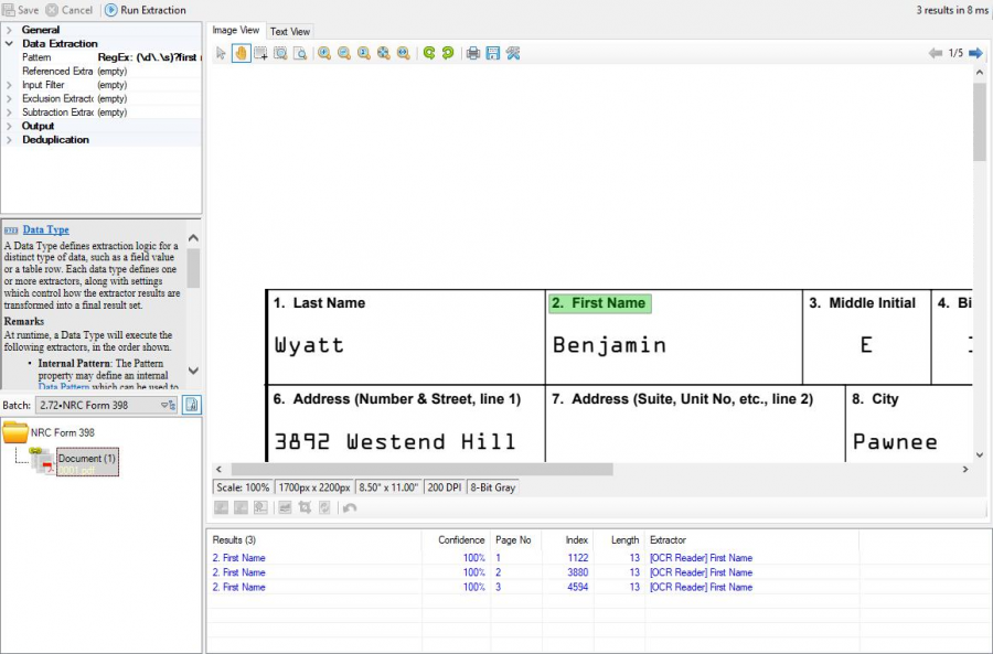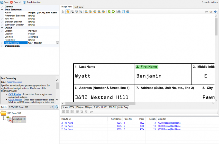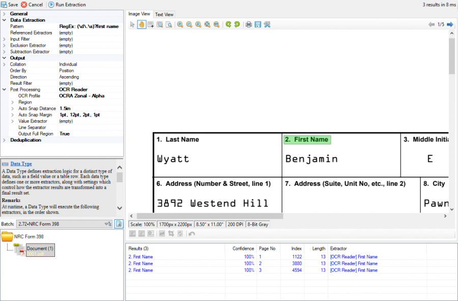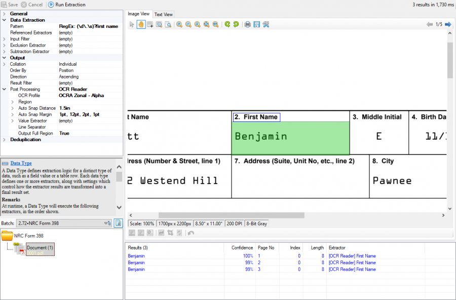 The idea for this scenario is to first extract the label for the value we want using a Data Type extractor 2. First Name, and then set the "Post Processing" property of that Data Type to run a special OCR Profile designed to extract the value associated with the label Benjamin.