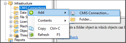 In the node tree, navigate to the "CMIS Connections" folder under the "Infrastructure" folder.