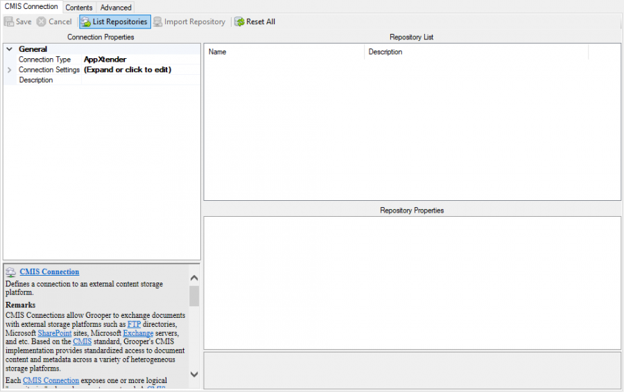 CMIS stands for Content Management Interoperability Services.  It is an open standard that allows different content management systems to inter-operate over the Internet.  This allows Grooper to use many different platforms, such as AppXtender, or Microsoft SharePoint, or even just the Windows file system, and more, for importing and exporting documents and their contents.  Once a CMIS Connection is created, Grooper can exchange documents with these outside platforms.
