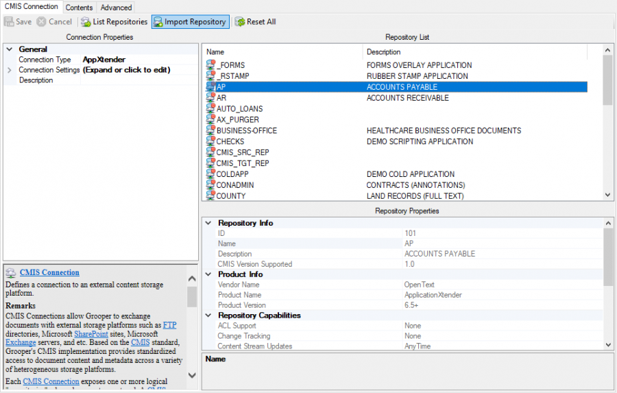 Upon connecting to an external content management system, Grooper will be able to see the "repositories" associated with it.  A repository, in computer science, is a general term for a location where data lives. Different systems refer to "repositories" in different ways.  An email inbox could be a repository. A folder in Windows could be a repository. A cabinet in ApplicationXtender could be a repository.