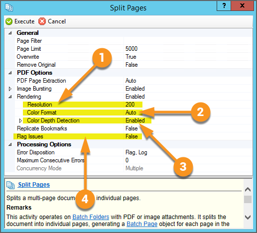 You may further configure the Split Action with the Split Options properties. These properties control how the child page objects are created, including their resolution, file format, and color depth settings. |