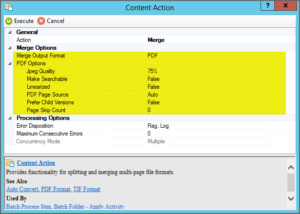 The Content Action Merge action is now its own activity, named Split Pages. You still have two options for merging child content into a multipage filetype, controlled by the Merge Format property.