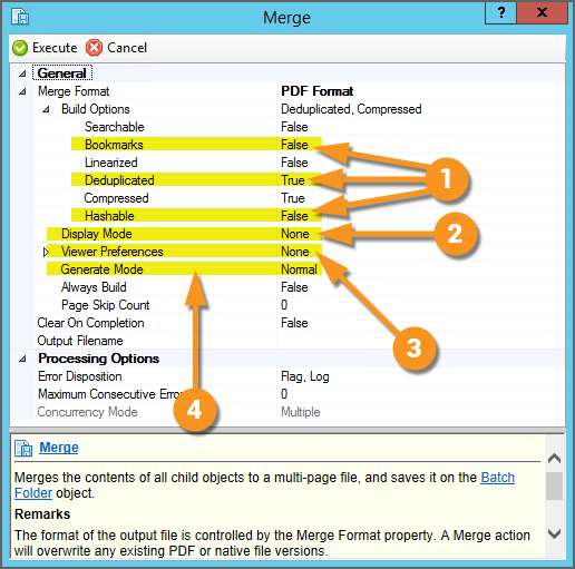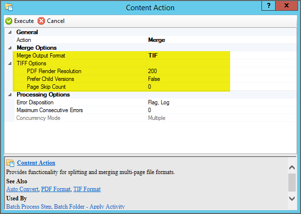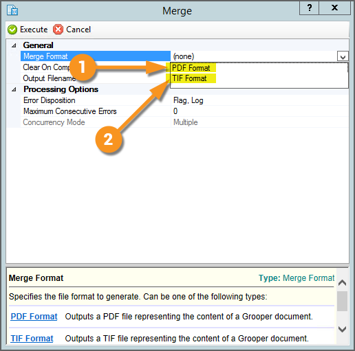 Changes - PDF Format The TIF Format option configuration is unchanged. However, there is a lot more you can do with the PDF Format with the Merge activity in 2021 than you could with the Merge Content Action in 2.90.