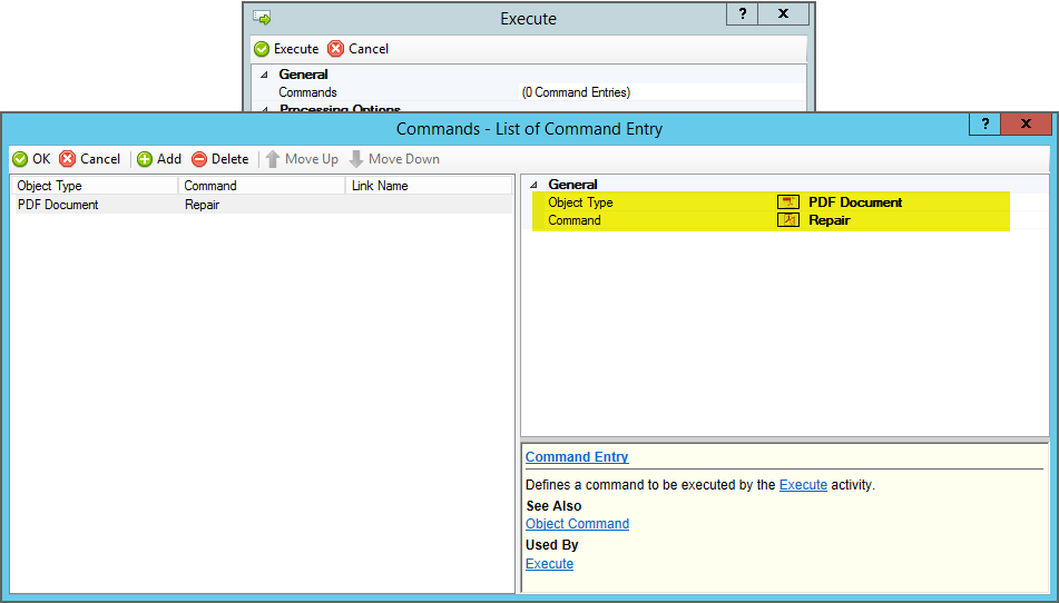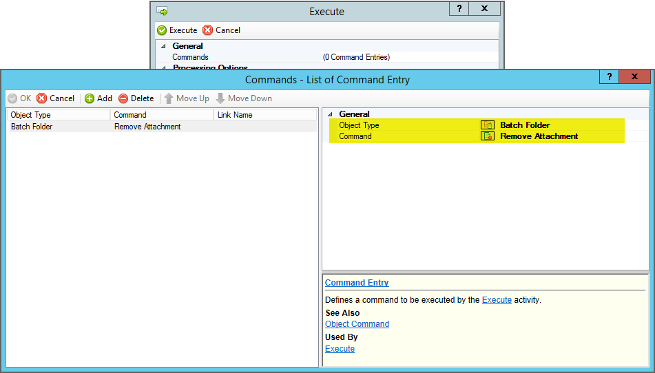 The Execute activity applies one or more execution commands to an object type. To configure the activity, you must define what command you want to execute. Do this using the Commands property. |