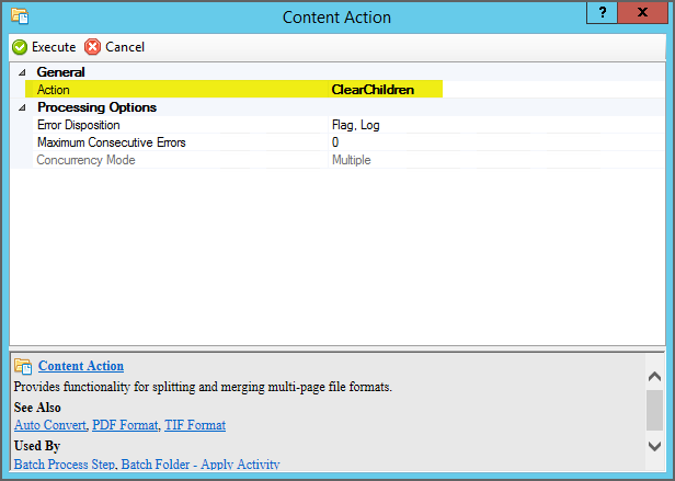 Content Action is an Activity providing additional functionality for multi-page file formats (PDF and TIF files) through one of five actions: Split, Merge, ClearChildren, ClearContent, and RepairPDF.