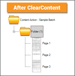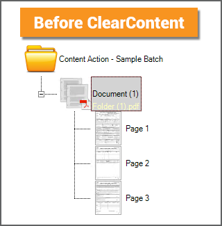 The ClearContent Action is a destructive action. Whereas the Merge action creates a file stored on a document folder, the ClearContent action deletes it. When applied to a Batch Folder, ClearContent will delete a native PDF (or TIF) version, if present. |