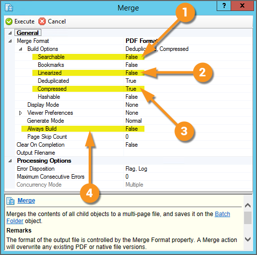 The child content can be merged into a PDF or TIF file. Depending on which format you choose, there are additional options for creating the merged file. For example, the PDF format includes an option to include the OCR text data for each page in the merged PDF via the Make Searchable property. |