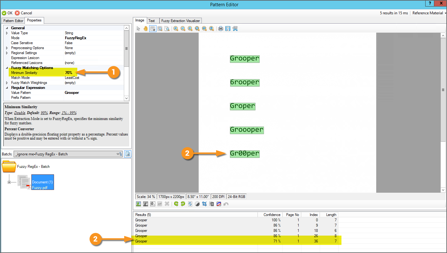 Fuzzy RegEx measures the similarity between a regular expression pattern and a potential match in terms of percentage similarity. The regular expression pattern Grooper matches the text string "Grooper" at a 100% similarity. It is an exact match. Being seven characters long, a single character in the string "Grooper" makes up roughly 14% of the word.