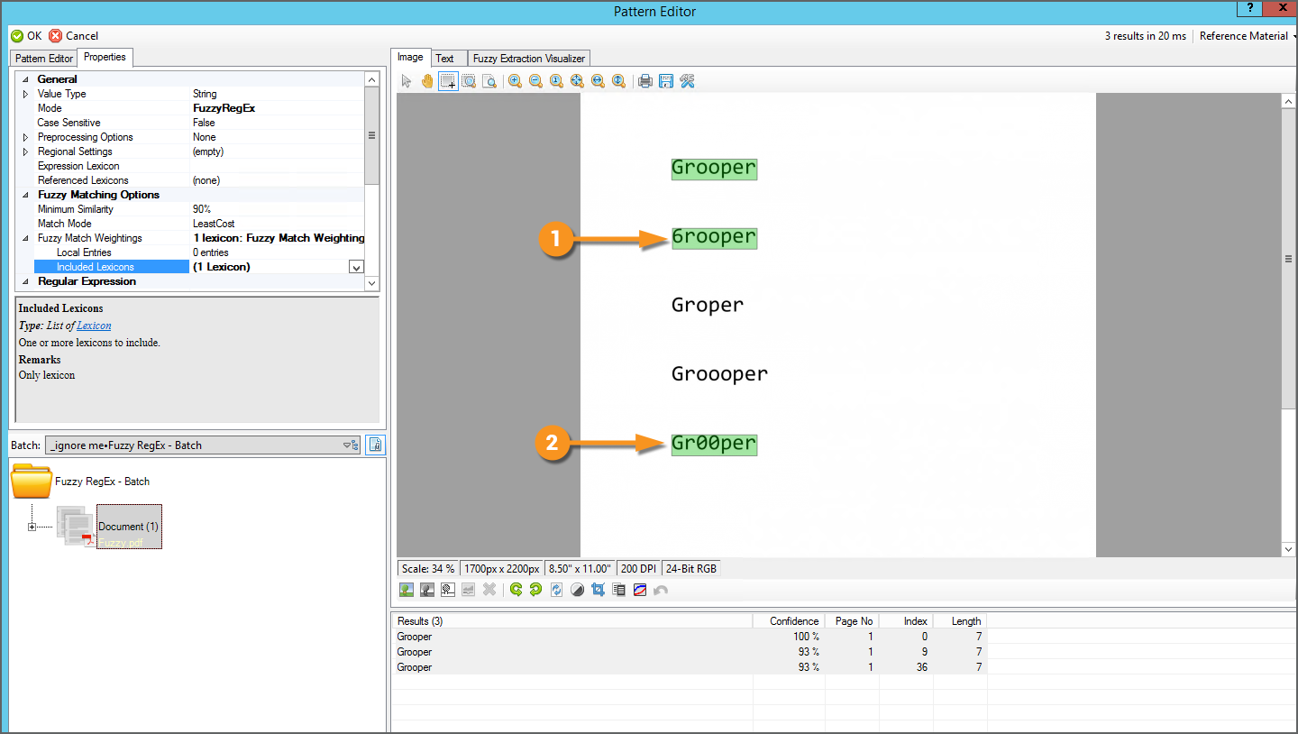 This also means Fuzzy RegEx not only matches imperfect matches, but it mutates them as well. In our example where our regex Grooper fuzzy matches "6rooper", the "6" would "swapped" for a "G", resulting in an 86% confident match.