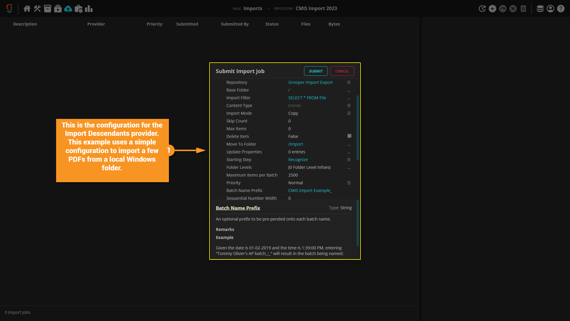 Import Provider: Import Providers enable Grooper to import file-based content from numerous sources, including Windows file systems, SFTP file systems, mail servers and various content management systems (CMS). An Import Provider is selected and configured when configuring "Import Jobs". Import Jobs are submitted in one of two ways: