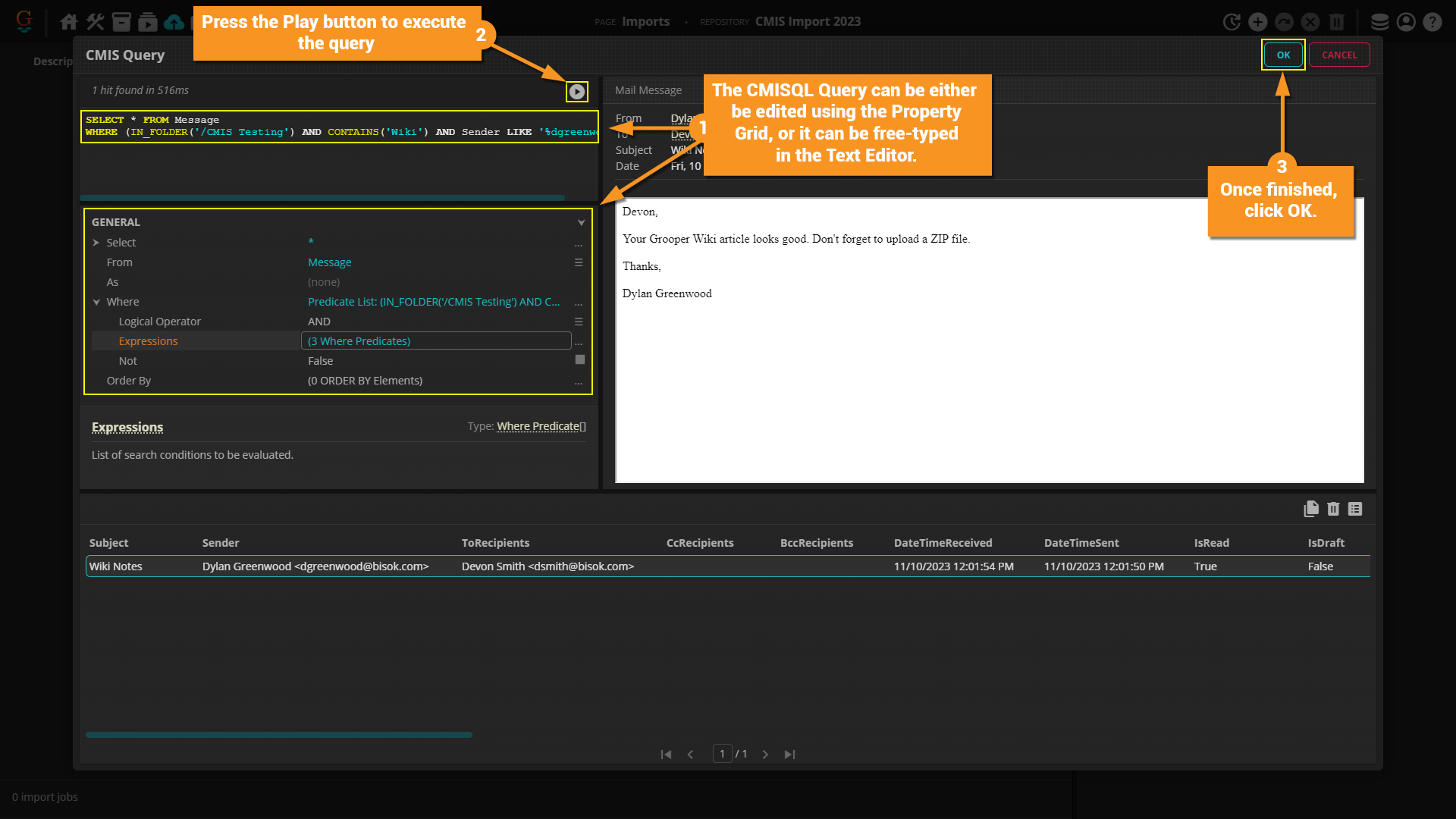 • For another example, you can use CMISQL queries to easily filter email messages when importing from an inbox. If you only wanted to import messages from a certain sender, from an certain folder, with a certain subject line and only ones that have not been read, you could filter out any emails that didn't meet those query conditions by comparing metadata properties (like "Sender" and "Subject") to your criteria.