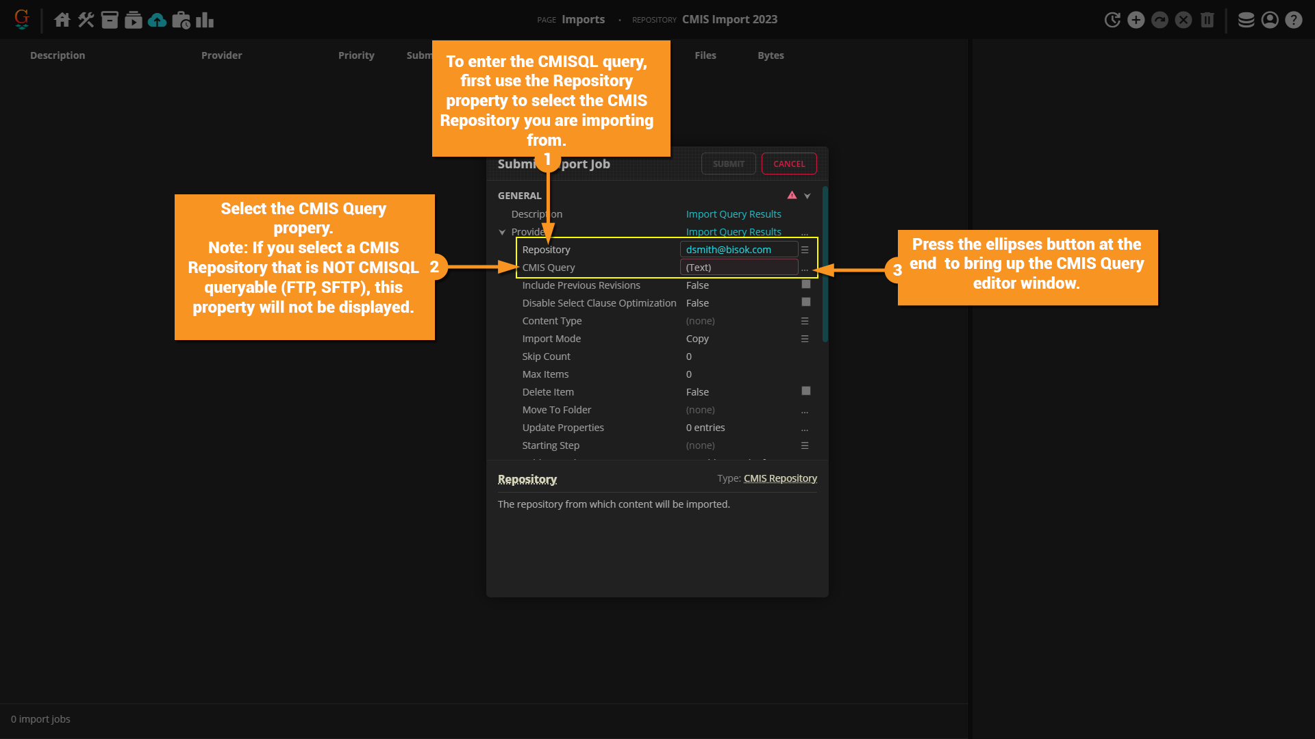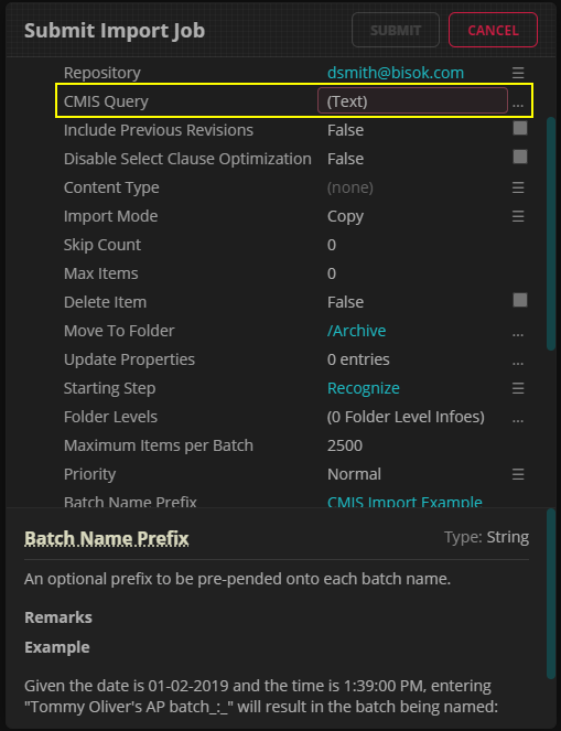 • Import Query Results allows you to selectively import files using a SQL-like query (called a CMISQL query). Only files returned by the query will be imported. For example, using an Exchange or IMAP CMIS Connection, you could query an inbox for emails from a specific sender and only import those emails.