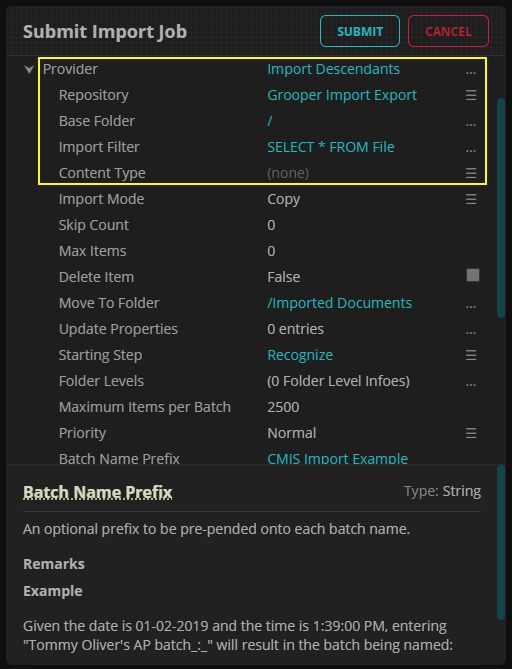 Import Descendants: Import Descendants is one of two Import Providers that use cloud CMIS Connections to import document content into Grooper. Import Descendants imports files from a settings_system_daydream CMIS Repository folder location, including any files in any sub-folders (i.e. all "descendant" files).