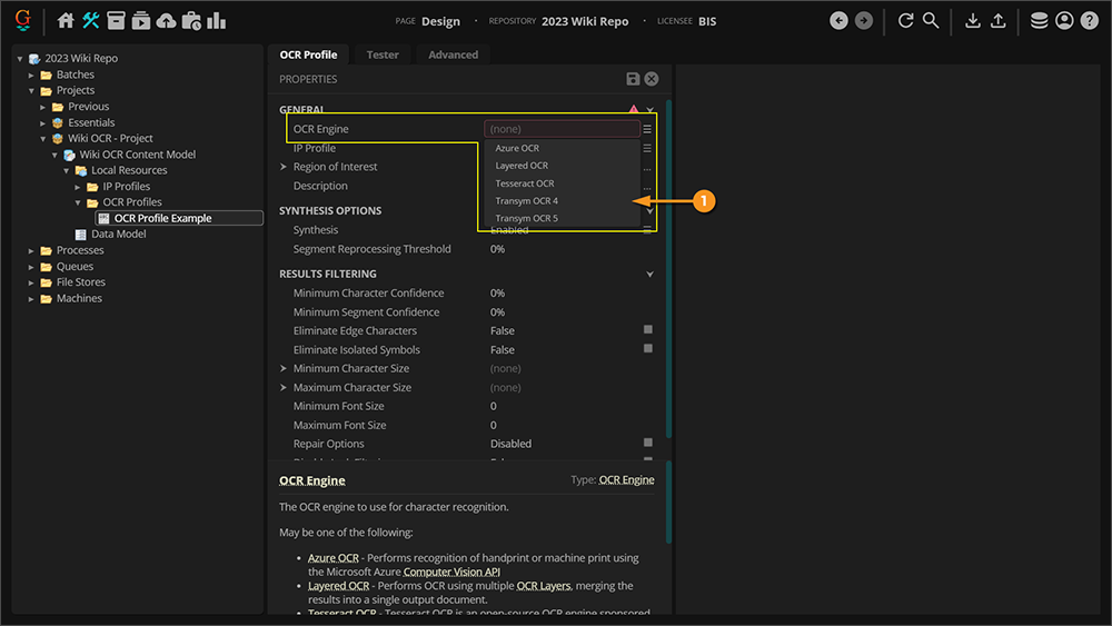 1. Bare minimum, you will need to select an OCR engine in order to obtain OCR results. To do this, select the OCR Engine property and choose an OCR engine from the dropdown menu.