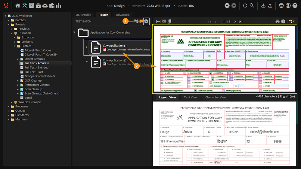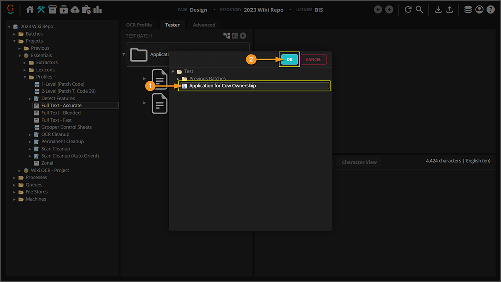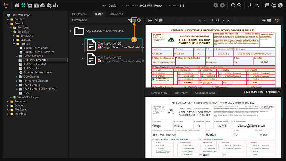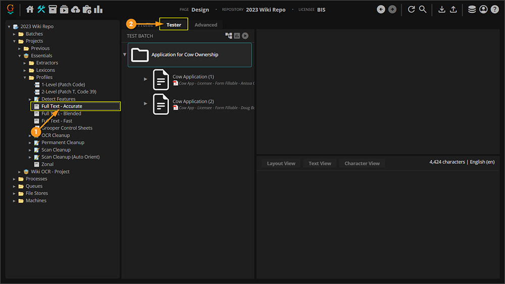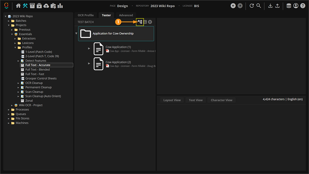 1. To access this testing module, first select an OCR Profile in the Node Tree. Here, we've selected the "Full Text - Accurate" OCR Profile that comes with all Grooper installations.
