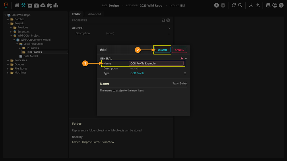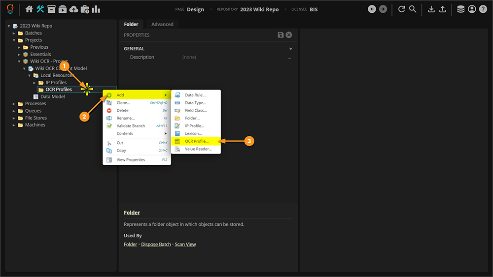 1. Navigate to the Local Resources folder in your Content Model folder in the Node Tree. Feel free to add folders under your Local Resources folder for organization. Here we have created a folder called "OCR Profiles". Right click on the folder.