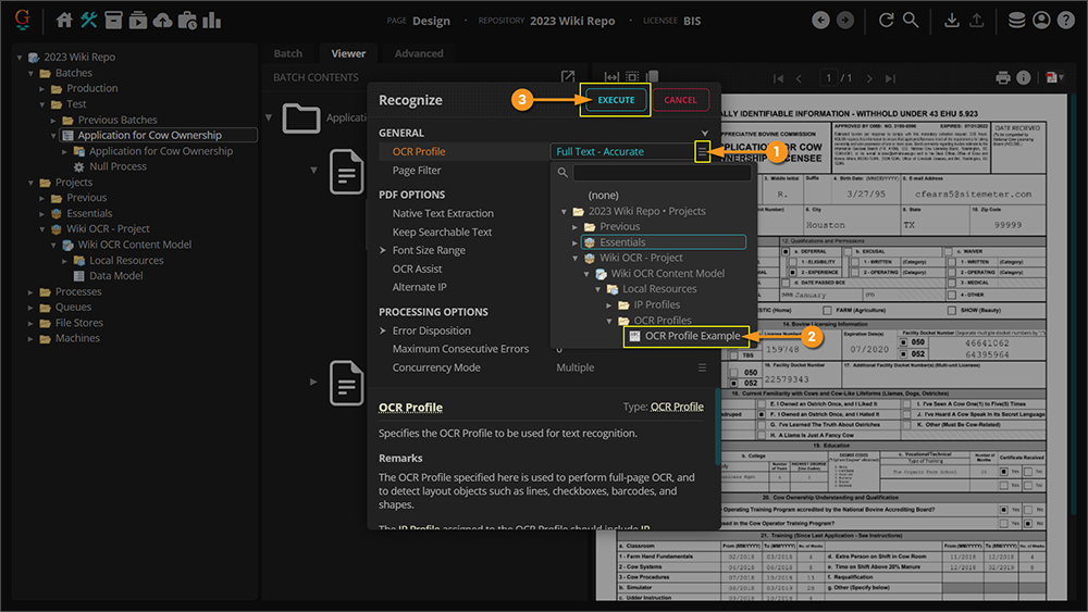 3. Click the "EXECUTE" button to run the Recognize activity using the selected OCR Profile on the page.