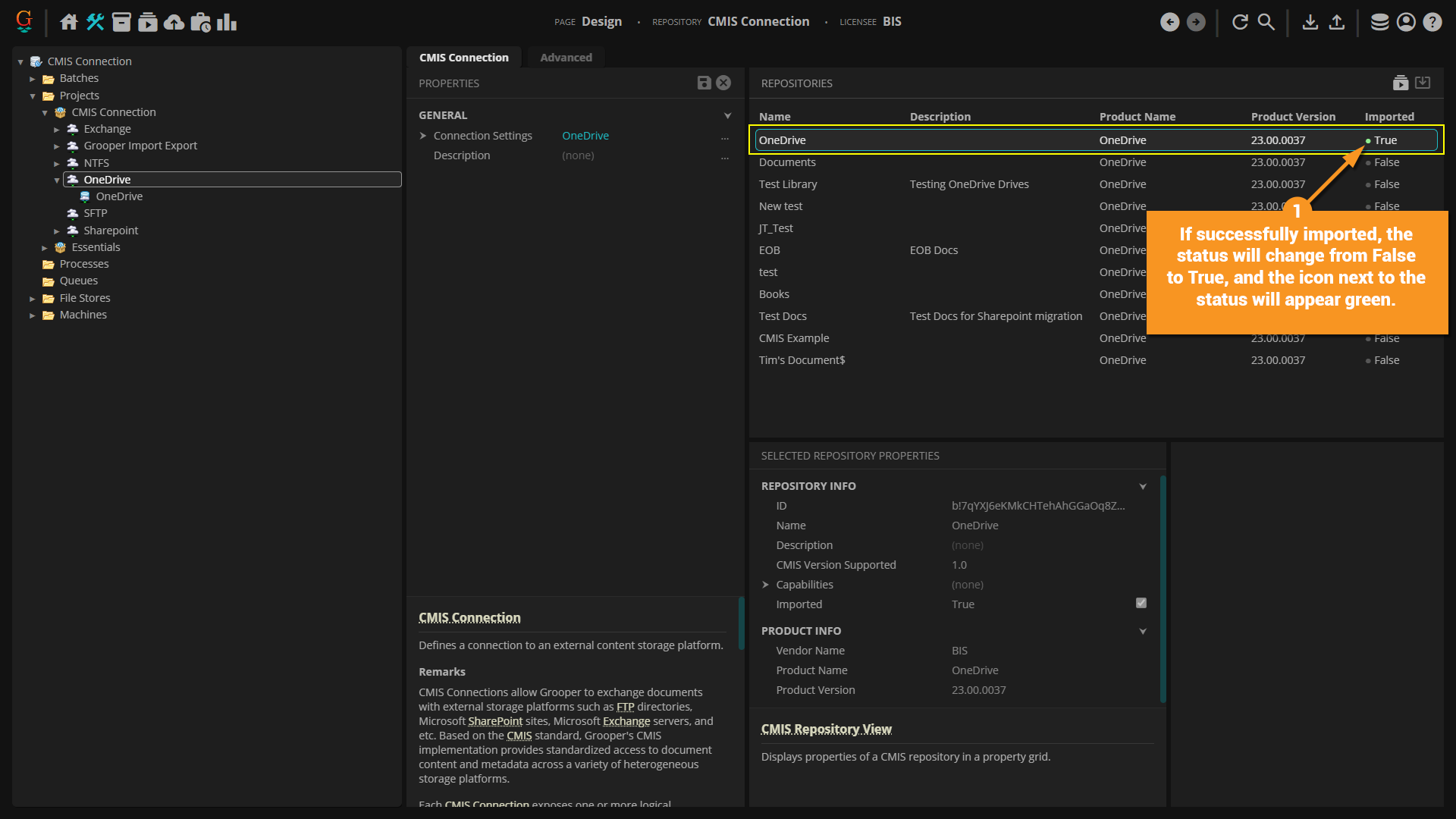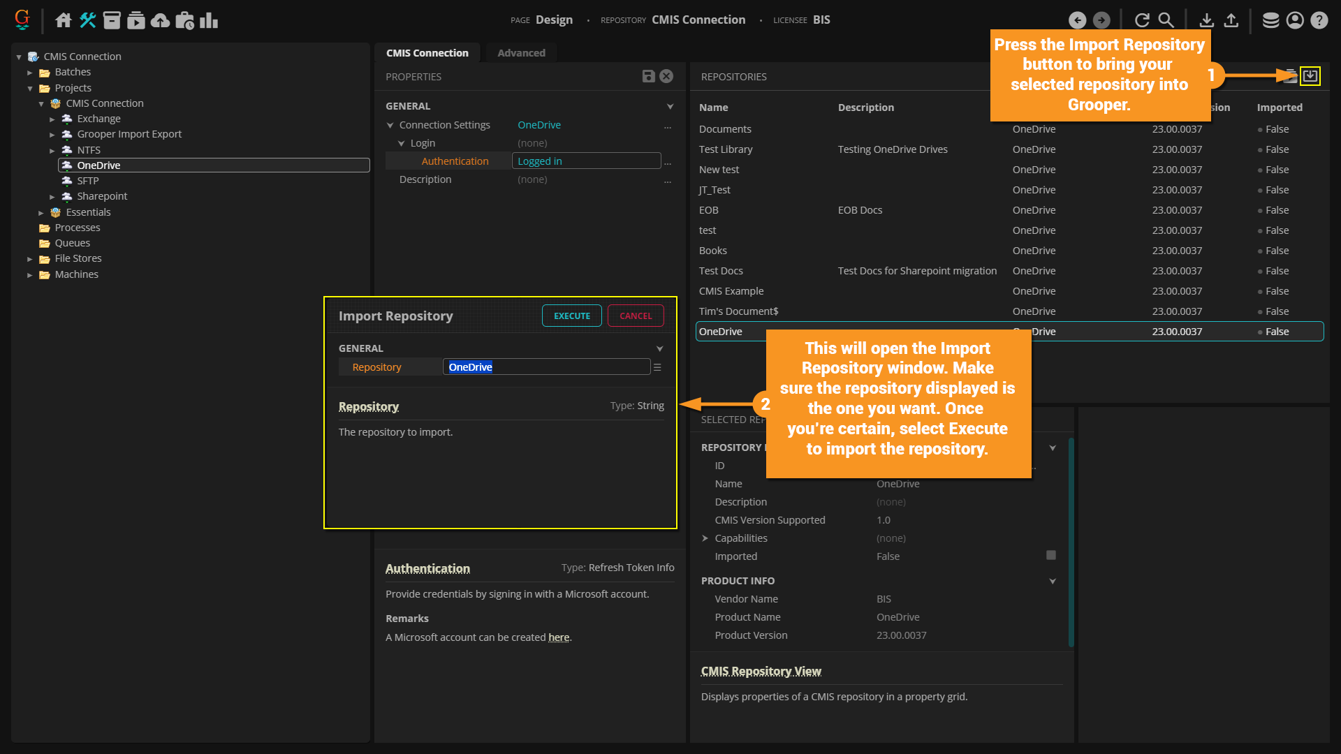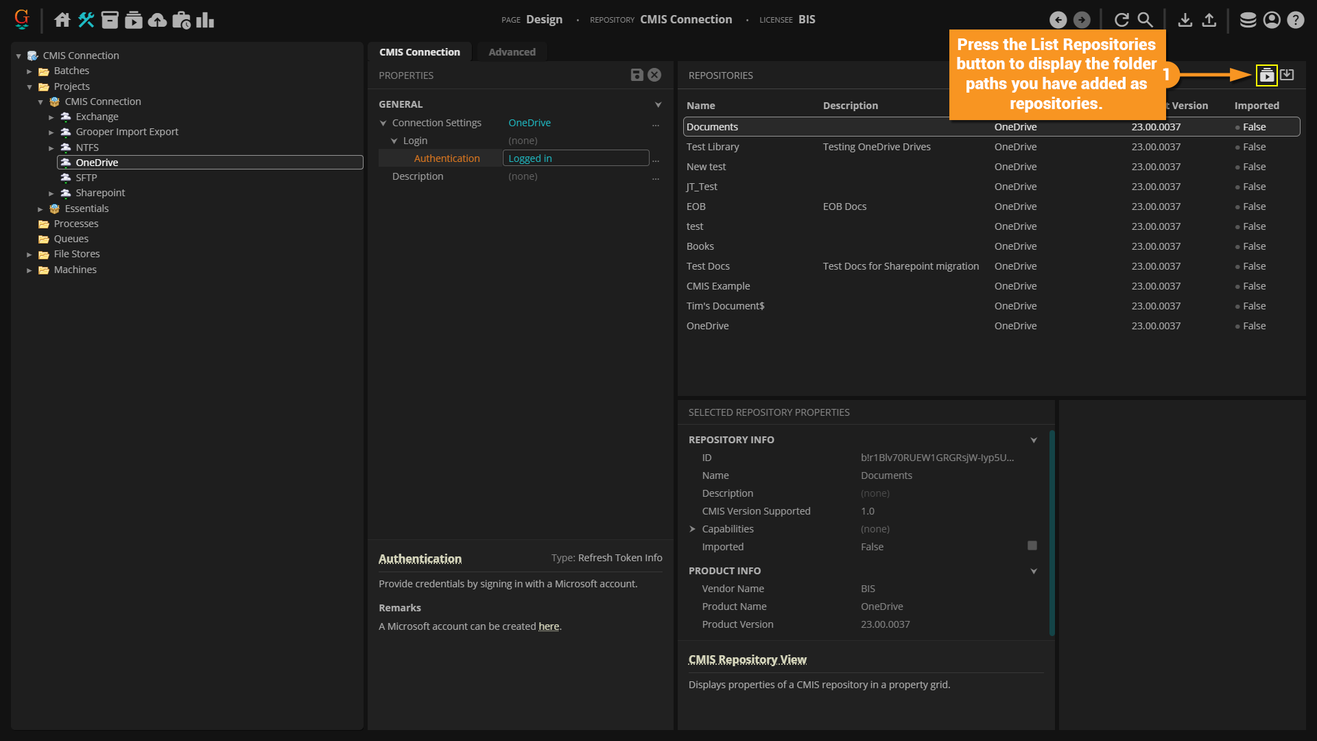 It provides access to OneDrive Personal or OneDrive for Business drives and SharePoint Online or SharePoint Server 2016 document libraries. More or less, all you have to do is sync Grooper and OneDrive by logging in using your OneDrive credentials and you can import from and export to your OneDrive folders. OneDrive drives and SharePoint libraries can be individually imported as a CMIS Repository. Each will expose themselves as hierarchical file system (HFS), where folders and files are represented by simple object types. As such, this binding is suitable for Unmapped rather than Mapped Export. You can still export metadata as a "buddy file" adjusting the Metadata Export property in the Unmapped Export Settings.