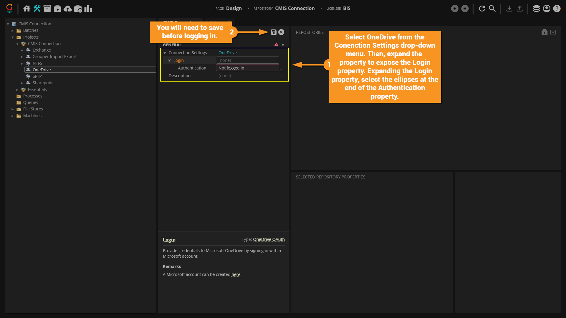 In the "Connection Properties" panel, select "OneDrive" from the "Connection Type" drop down list. Expand the "Connection Settings" heading and the "Login" heading under that.  Select "Authentication" and press the ellipsis button at the end of the line.