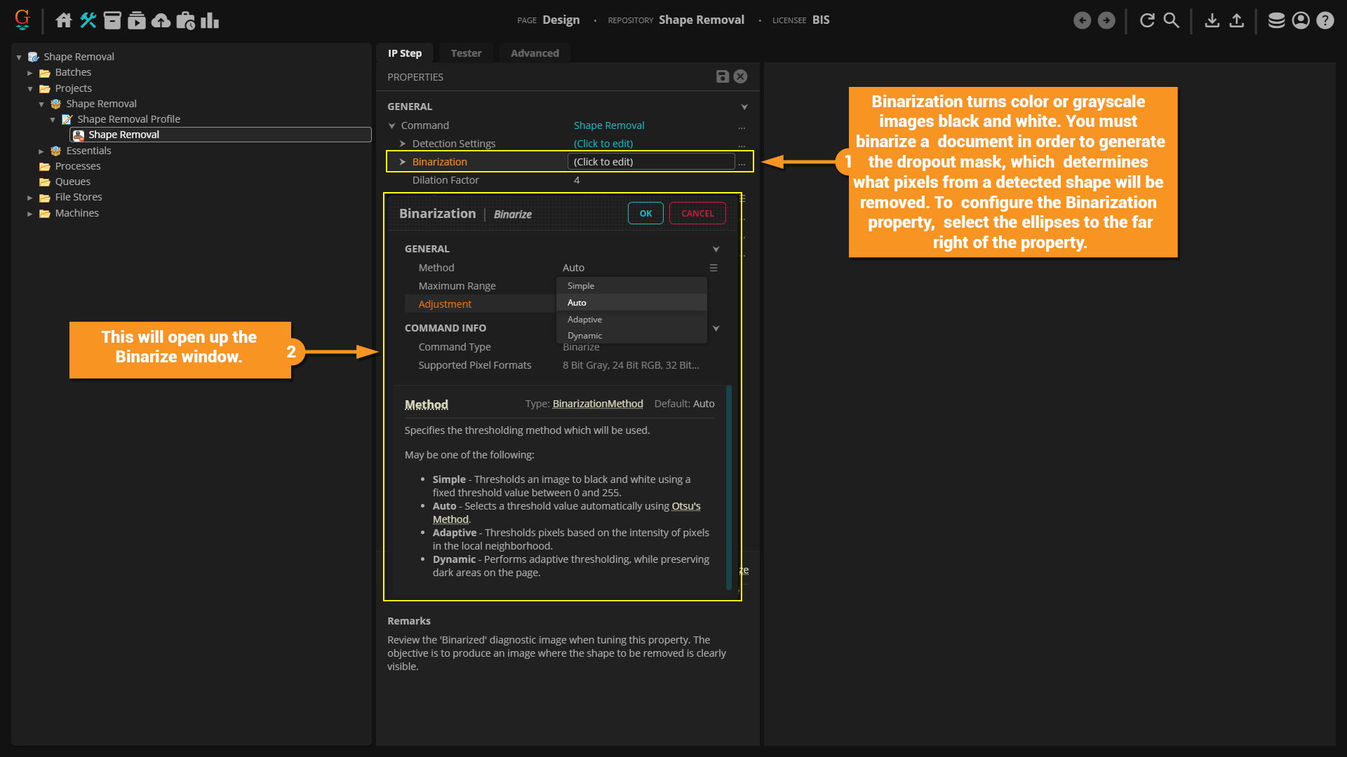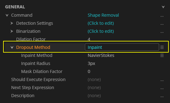 There are four configurable properties available to Shape Removal: Detection Settings, Binarization, Dilation Factor, and Dropout Method. Some of these have substantial subproperies available to them. They are all detailed below.