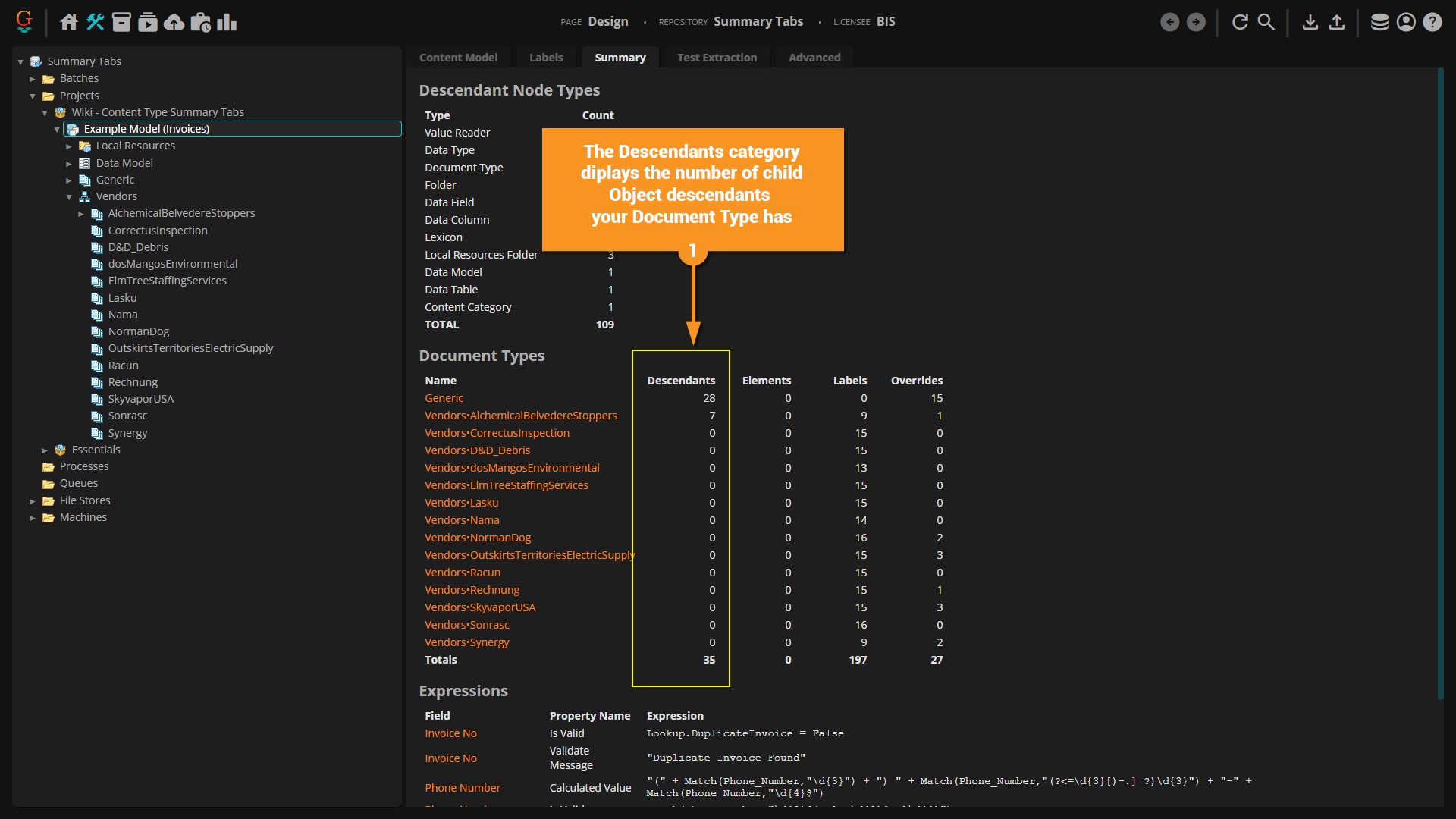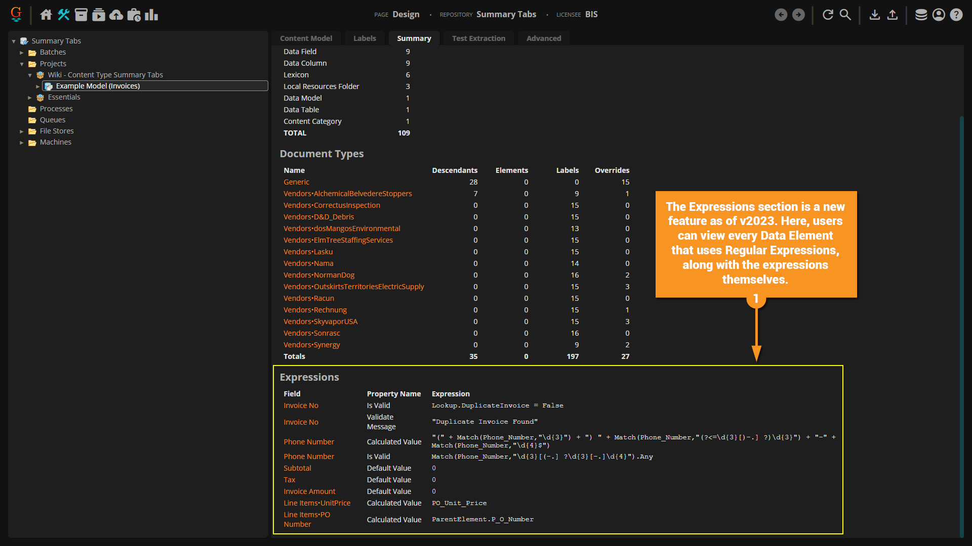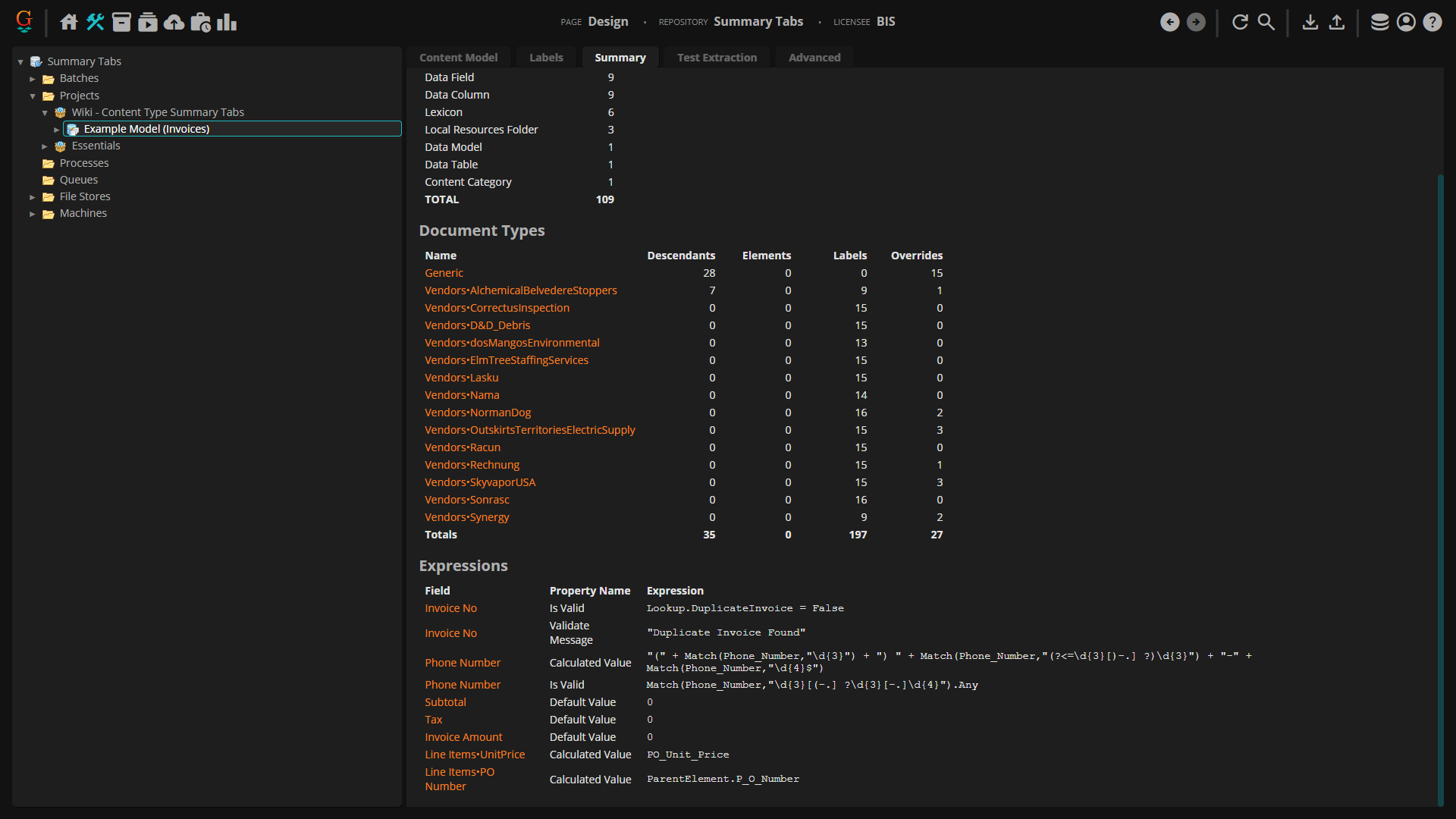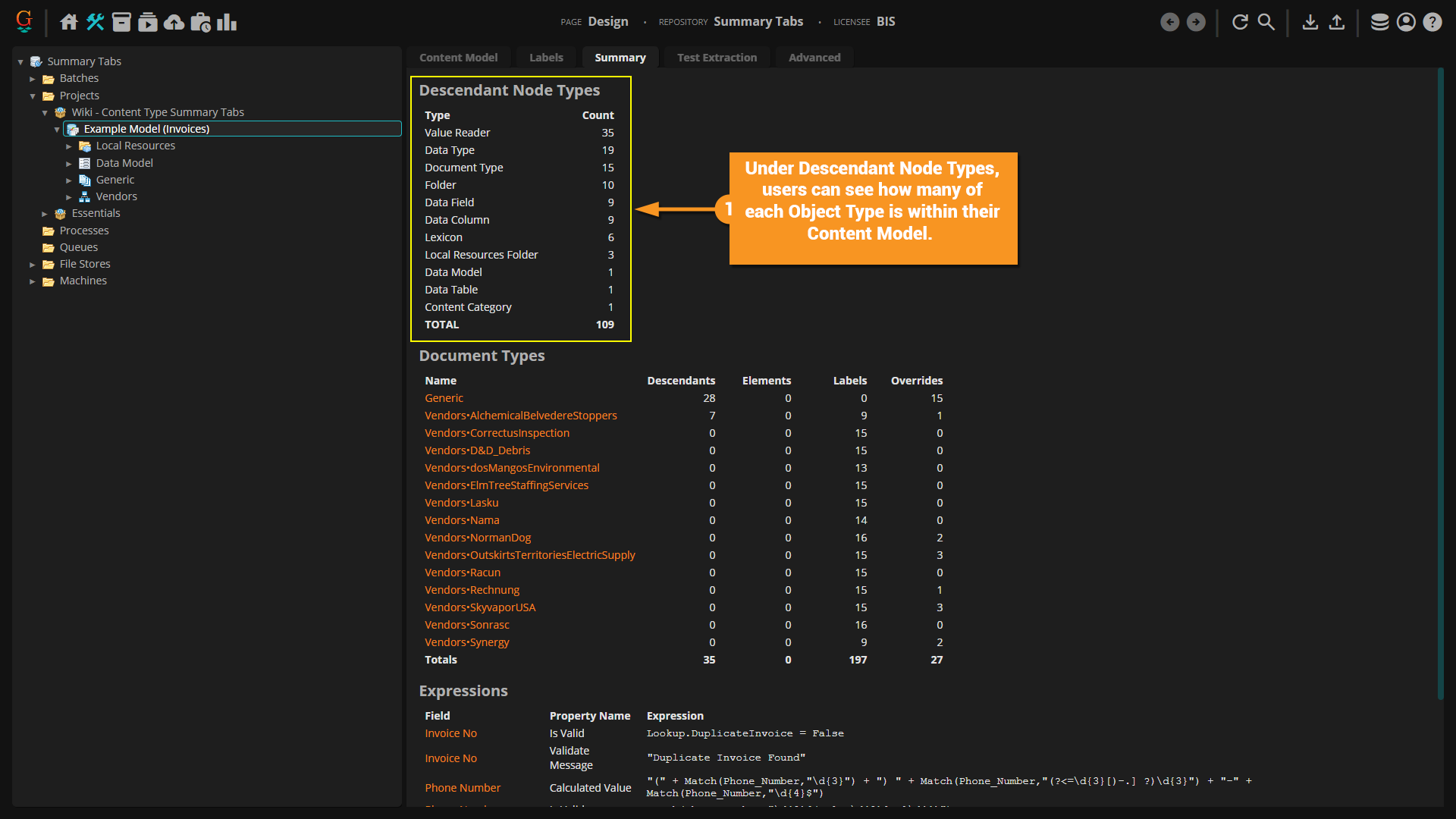 The Summary Tab is a new feature in Grooper 2023. It displays "at-a-glance" information about the selected node and its children.