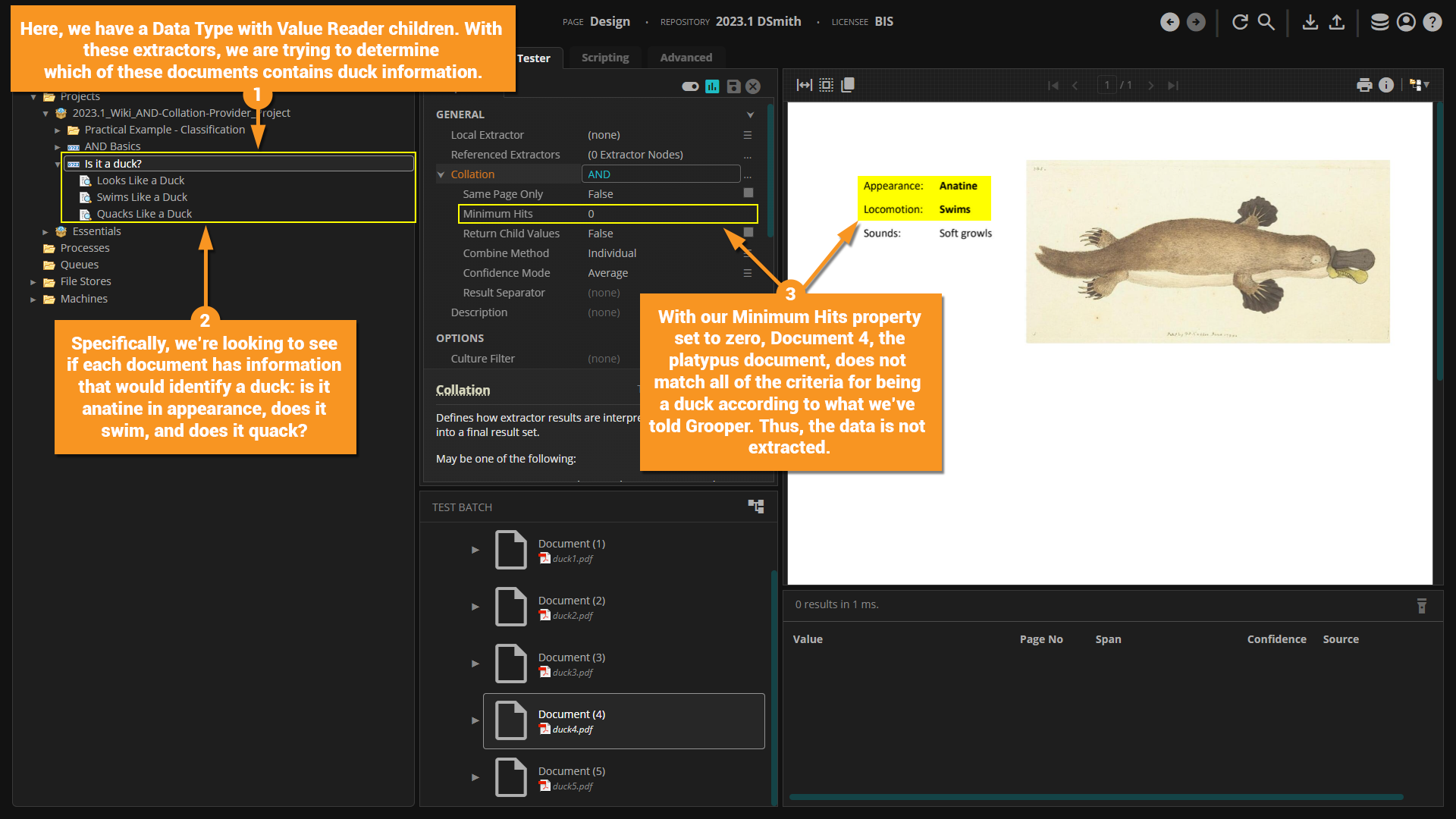 3. With the Minimum Hits property set to 0, Document 4, the platypus document, does not match all the criteria necessary for identifying a duck according to what we've told Grooper. Therefore, the data is not extracted from that document.