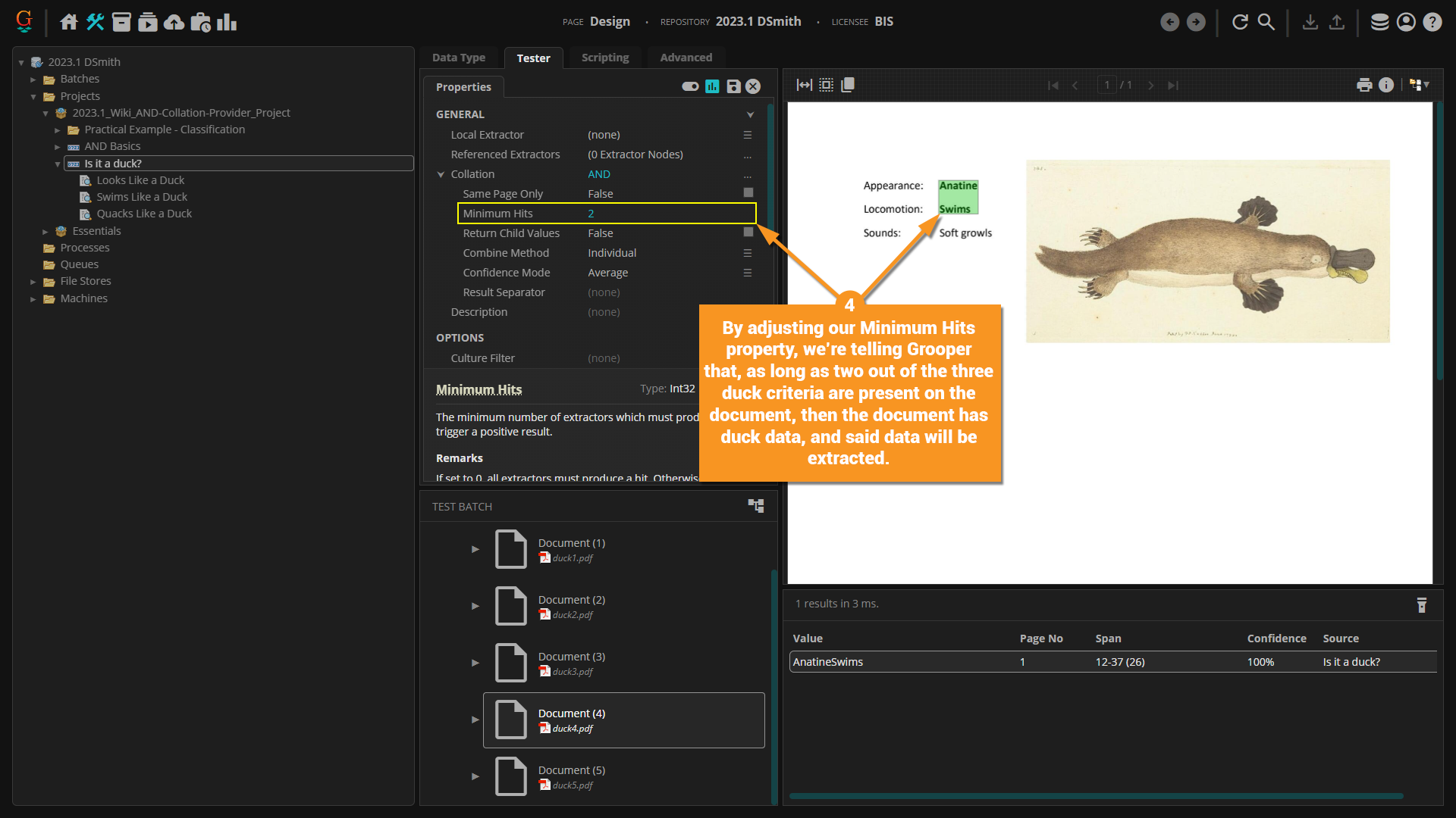 1. However, when the Minimum Hits property is adjusted, this tells Grooper that, as long as two of the three criteria are present, then the document has duck data, and said data is to be extracted.