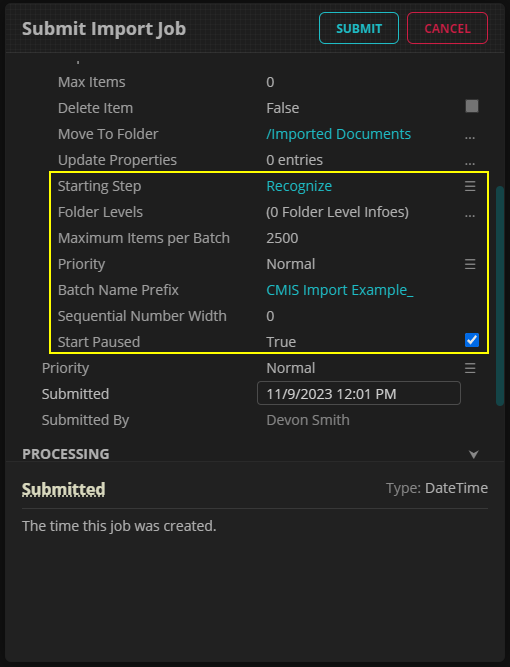 3. This brings up the "Submit Import Job" editor.