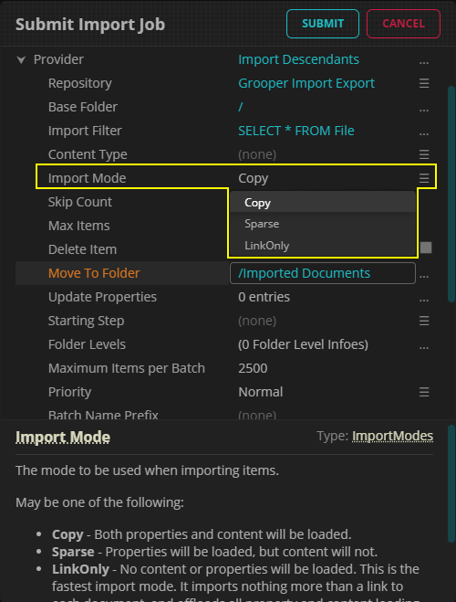 The Import Provider's "Import Mode" controls how file content and data associated with that file (its properties and any metadata field values in a content management system) are imported into Grooper. Practically speaking, this has an effect on the overall speed of the import process.