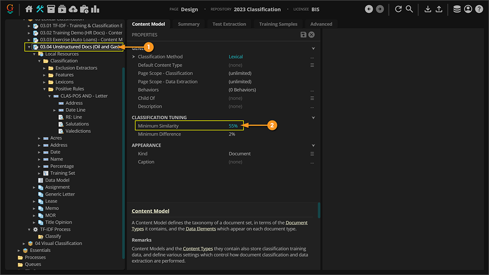Setting the Classification Method property on a Content Model to Lexical or Rules-Based, one can set up Positive Extractors on Document Types. If this extractor returns a result above the Minimum Similarity set on the Content Model, the document will be assigned that Document Type during classification. By default a result from an extractor is returned at 100% confidence (unless Fuzzy RegEx is leveraged to return a result, in which case the confidence will be affected by the fuzzy algorithm.) Given this fact positive extractors are almost certain to be above the Minimum Similarity.