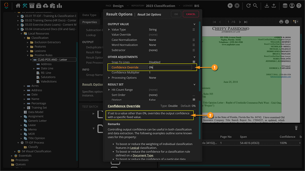 Some results carry more weight than others. The Confidence Multiplier and Output Confidence properties allow you to manually adjust an extraction result's confidence.