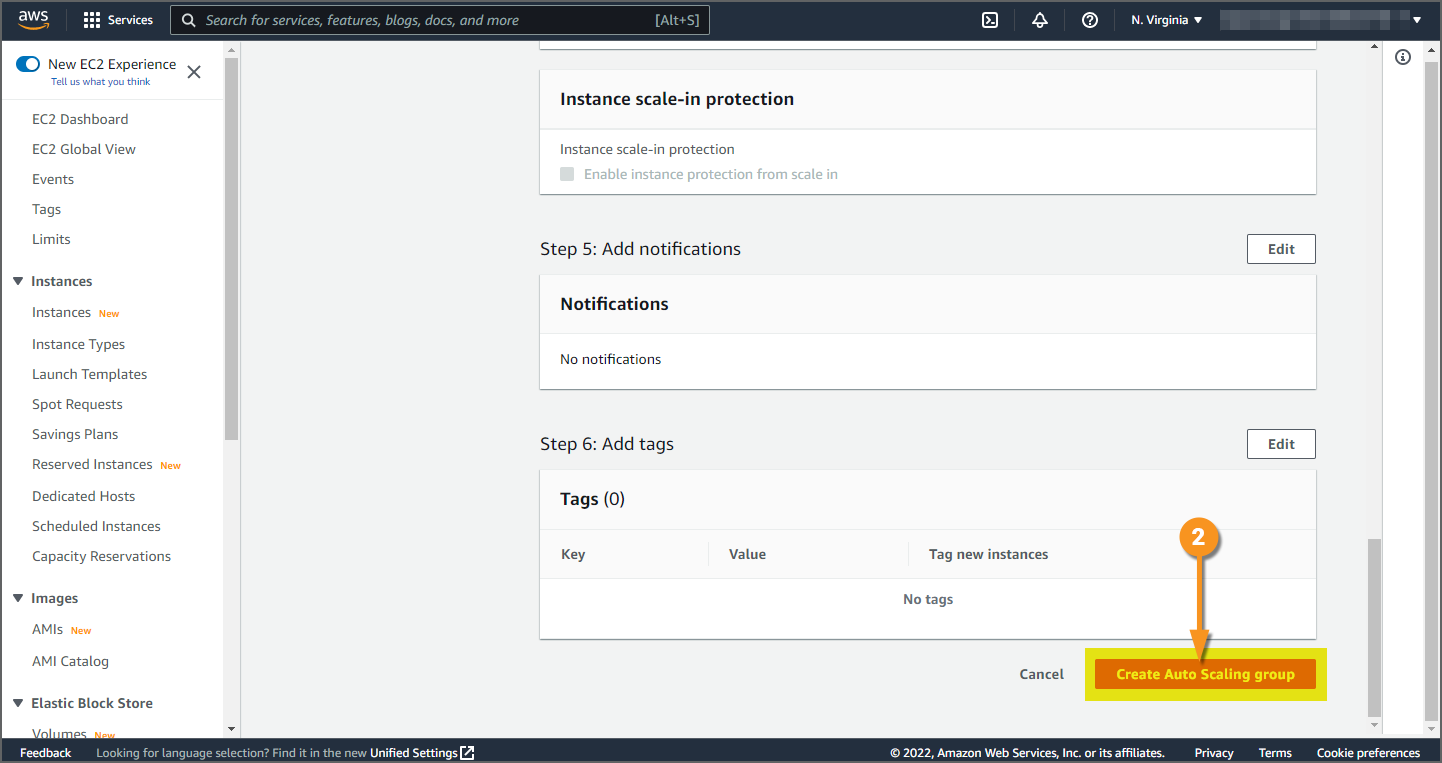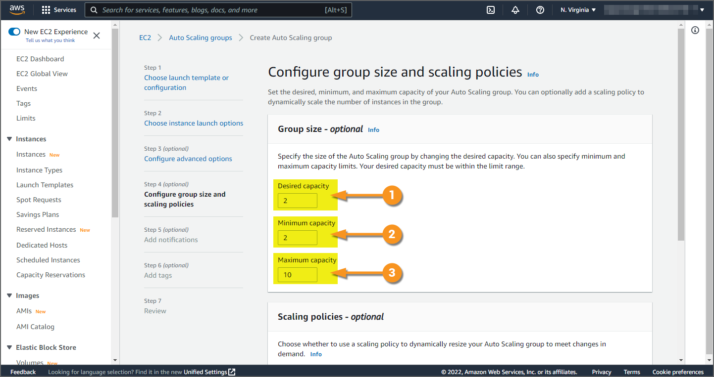- This defines the minimum and maximum number of virtual machines to be added as well as the scaling rules, what conditions should be met to spin up and down new EC2 instances.