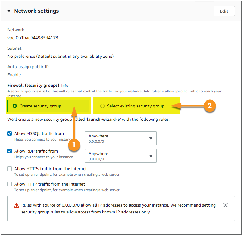 Generally speaking, every organization will have their own network security requirements. Your IT department will need to configure the EC2 instance's Network Settings panel according to your needs. For the purposes of this demo, we will use the default Network Settings.